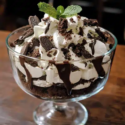 - Garnish: Once chilled, garnish the top of the trifle with chopped chocolate or chocolate shavings, extra crushed Oreos, and fresh mint leaves. This adds a decorative touch and enhances the flavors.