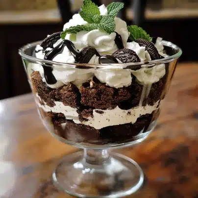 If you love indulgent, layered desserts that combine your favorite treats into one irresistible masterpiece, then look no further than the Mint Brownie and Oreo Hot Fudge Trifle with Minty Cream Cheese Whipped Cream. This dessert is a showstopper, boasting a delightful combination of rich, fudgy brownies, crunchy Oreo cookies, warm and gooey hot fudge, and a refreshing minty whipped cream topping that ties everything together. The layers are a visual treat as well as a flavorful one, ensuring that this trifle is the star of any gathering.
