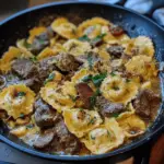 - Add the Steak: Arrange the sliced steak on top of the ravioli or gently toss it into the skillet with the pasta.