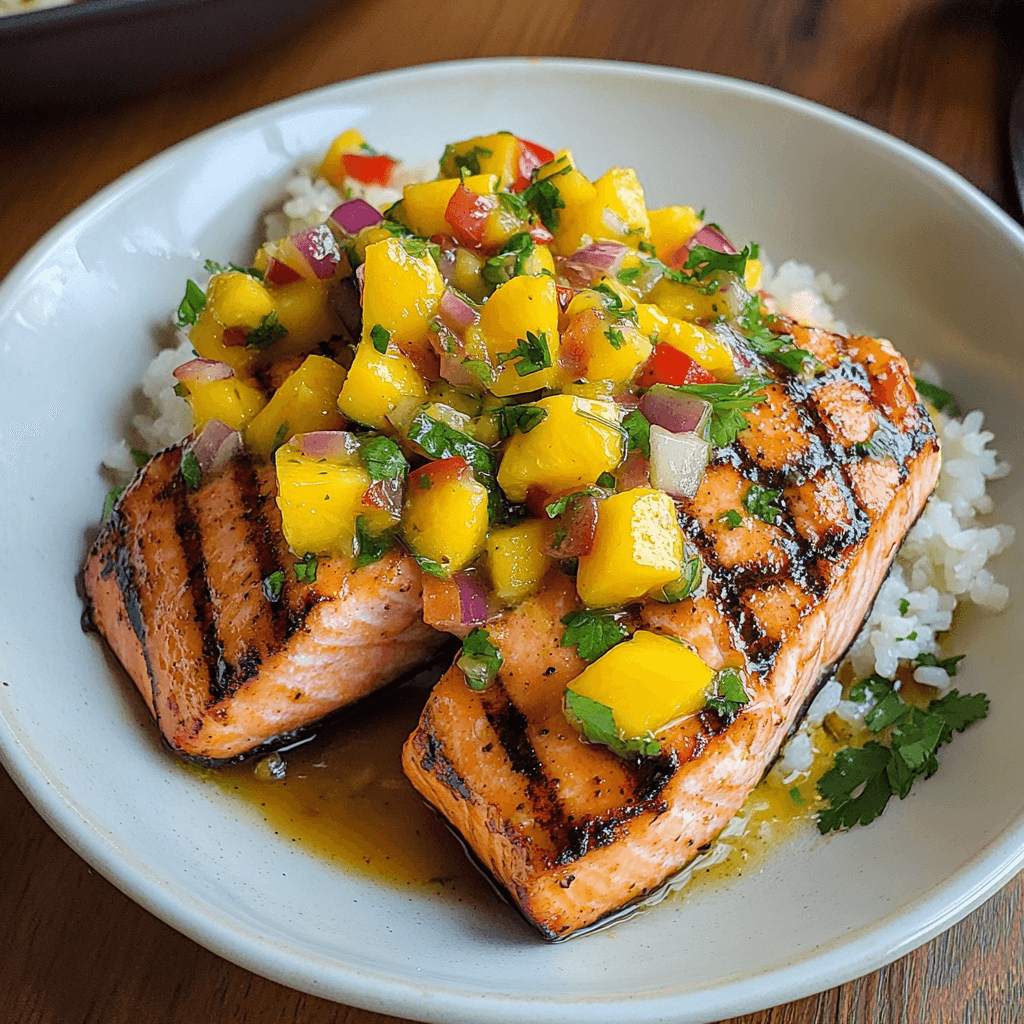 Plate the Salmon: Place the cooked salmon fillets on a serving plate. Spoon the mango salsa generously over each piece of salmon, ensuring that the salsa covers the top.